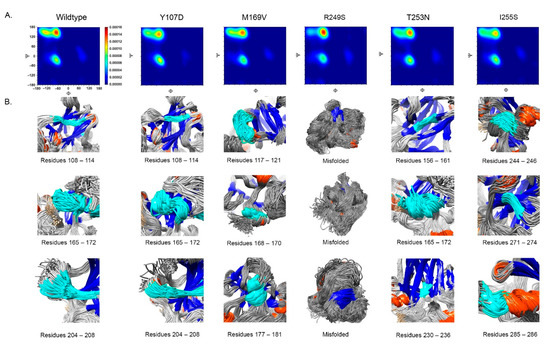 Figure 6. Impact of missense VUS on TP53 local structure. (A) Ramachandran density plot for missense VUS M169V, N239T, R249S, I255S, and P278R. The β strand regions (ϕ, ψ = (−130, 140)) for Y107D, M169V, R249S, T253N, and I255S were notably diminished, and the PII-spirals (ϕ, ψ = (−45, +135)) for R249S were intensified in comparison to the wildtype. The color change from red to blue represented the density from high to low, respectively. (B) Graphical illustration for local structural changes in Y107D, M169V, R249S, T253N, and I225S. WT residue positions were shown only for Y107D with the residues 108–114, 165–172, and 204–208. R249S showed global misfolded structure of TP53. Blue: β strand; orange: α helix; grey: linker joint; cyan: additional structural features.