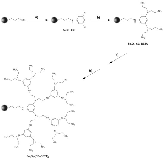 The synthetic protocol for obtaining the triazine dendron-functionalized magnetite nanoparticles as an introduction of cyanuric chloride (CC) and diethylenetriamine (DETA) to the surface of Fe3O4-NH2: (a) CC, THF, 2 °C—2 h; (b) DETA, ACN, RT—16 h, reflux—24 h.