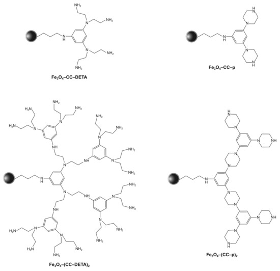 The nanoparticles of magnetite were synthesized following the standard co-precipitation approach, while their further encapsulation with a thin silica layer was performed via the Stöber process [32]. The prepared Fe3O4/SiO2 particles were then subjected to functionalization with a silane derivative containing aminopropyl chain, leading to a magnetically susceptible material with free terminal NH2 groups as a precursor for the synthesis of the designed triazine dendron-grafted materials. Obtaining the final hybrid materials was based on two steps: (a) the incorporation of cyanuric chloride (CC)—a branching unit—to terminal amine groups and (b) the introduction of the aminocomponent (diethylenetriamine (DETA); or piperazine (p)). The aforementioned synthetic approach is illustrated in Figure 1. Each of the steps is based on the substitution of chlorine atoms of cyanuric chloride with amine groups, either anchored to the surface or added as a reactant. The main advantage of the adopted method is the chemoselectivity of chlorine atoms undergoing nucleophilic substitution at different reaction conditions. Namely, the substitution of the first chlorine atom takes place at a lowered temperature of <2 °C, the second atom at room temperature, and the third at elevated temperature (reflux); thus, the temperature control allows for easy directing of the dendrons growth. Therefore, following the described synthetic protocol, two materials containing first-generation dendrons, G1 (only one branching level; materials Fe3O4–CC–p and Fe3O4–CC–DETA), and two materials containing second-generation dendrons, G2 (two branching levels; materials Fe3O4–(CC–p)2 and Fe3O4–(CC–DETA)2), were obtained, which are presented in Figure 2.