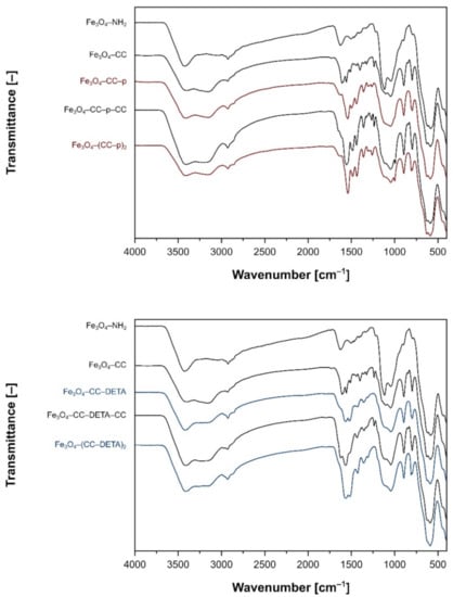 The FT–IR spectra of the magnetic support (Fe3O4–NH2), the cyanuric chloride (CC) intermediates (Fe3O4–CC and Fe3O4–CC–amine–CC), and the dendron-functionalized materials (Fe3O4–CC–amine and Fe3O4–(CC–amine)2) containing piperazine (p) (top) and diethylenetriamine (DETA) (bottom) as an amine domain.