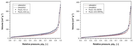 Moreover, the materials containing full dendrons of the first or second generation were analyzed for their porous features using the N2 adsorption/desorption method, which isotherms are presented in Figure 4, while the obtained porosity parameters are listed in Table 1. The effect of the dendrons’ generation on the porous properties of the materials is rather insignificant, which is proved by a high similarity of the corresponding isotherms obtained for the materials grafted with dendrons of the first and second generation. The pore size values calculated for the materials containing first-generation piperazine-dendrons are lower than those calculated for DETA-dendrons, which is connected with the branching character of both amines. Piperazine as the structurally compact amine creates the smaller cavities, while DETA triggers the creation of bigger pores since its attachment leads to branched units. On the other hand, the second coupling step promotes the formation of a bigger size for Fe3O4–(CC–p)2, while smaller for Fe3O4–(CC–DETA)2, which is connected with loosing and tightening of the dendrons, respectively. These findings are consistent with pore volume values, also listed in Table 1.