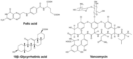 The synthesized and characterized materials have been studied for their binding potential of three biocompounds: folic acid, 18β–glycyrrhetinic acid, and vancomycin, which are presented in Figure 5. The choice of these biologically active agents was predominantly driven by their acidic character (presence of free carboxylic groups), which triggers their attractive interaction through the exchange of a proton between the –COOH domain of the analytes and free terminal –NH– or –NH2 groups of the synthesized triazine-based dendrons. Such an exchange leads to a formation of two oppositely charged species undergoing electrostatic interaction, and thus the drugs adsorb on the materials’ surface.