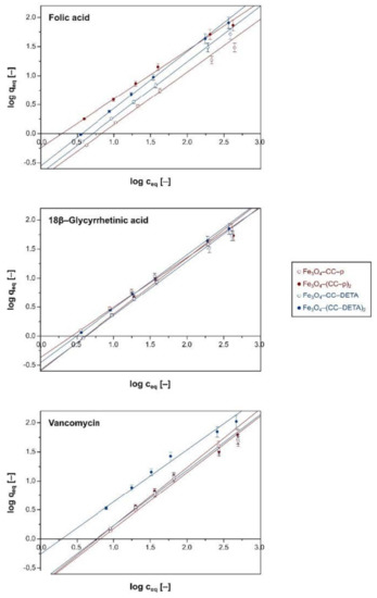 All the obtained dendron-modified supports were subjected to adsorption isothermal studies. The experimental data were further fitted to the Langmuir (Supplementary Figure S1) and the Freundlich (Figure 6) models, which parameters are collected in Table 2. Each of the adsorption processes followed the Freundlich isothermal model, proved by significantly higher linear correlation coefficient R2 values than those calculated for the Langmuir model, as well as lower values of χ2, proving better correlation with the regression line. Such results are easily explainable since the Freundlich model assumes the probability of the intermolecular interactions of adsorbate molecules, which potentially happens through the π–π stacking effect of phenyl rings of the analytes. The calculated 1/n parameters, connected with the strength of the adsorption process, reached very high values >0.80, indicating the high adsorptive potential of the materials [34,35]. Nevertheless, on the basis of the experimental data fitting to the Langmuir model, the maximal adsorption capacity values qm were calculated, which are collected in Table 2. The adsorptive potential of the materials towards the chosen drugs is strictly dependent on both the structure of the pending triazine-based dendrons and the structure of the drugs. The materials containing double-branched dendrons ((CC–p)2 and (CC–DETA)2 domains) showed two times higher adsorption capacities than the materials containing corresponding single-branched domains, which is caused by the presence of a higher number of terminal amine groups that are able to interact with the drugs molecules. Additionally, the use of DETA as an aminocomponent has led to the materials of higher sorptive potential than those containing piperazine as a repetitive block, which is due to the (a) better branching character of DETA, leading to more expanded dendritic structures, and (b) the incorporation of a higher number of free –NH2 groups on the materials’ surface. Taking the aforementioned dependence into account, the least adsorptive material is material Fe3O4–CC–p, in which the adsorption capacities towards the biomolecules varied between 53.33 and 75.82 mg g−1, while the most potent adsorptive material is Fe3O4–(CC–DETA)2, in which the sorptive capacity was in the range of 132.42–401.61 mg g−1 for the drugs used. On the other hand, the structure of the adsorbate’s molecules also influences their ability to interact with the surface of the materials. Among the three used drugs, folic acid is the only molecule containing two carboxylic molecules, leading to an enhanced stabilization of its electrostatic interactions with amine groups on the materials’ surface, which is especially proven for its adsorption on the materials functionalized with DETA-containing dendrons, reaching qm values of 170.07 and 401.61 mg g−1 for Fe3O4–CC–DETA and Fe3O4–(CC–DETA)2, respectively. In the case of vancomycin—a glycosylated polypeptide—the carboxylic group is hindered with a sterically expanded residue, which might decrease its ability to interact with the materials. Nevertheless, the materials showed an adsorption capacity towards vancomycin in the range of 68.17–132.45 mg g−1.