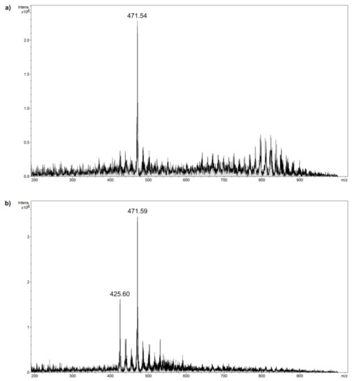 The materials containing the dendrons of the second generation ((CC–p)2 and (CC–DETA)2 domains) with the adsorbed drugs on their surface were subjected to FAPA–MS analysis, which involves the ionization of the analyte in the flow of plasma generated outside the spectrometer using the Flowing Atmospheric-Pressure Afterglow (FAPA) ionization technique. In the case of the three studied biocompounds, the only one which was ionizable from the material–drug complexes in the plasma stream was 18β–glycyrrhetinic acid. The FAPA–MS spectra of materials Fe3O4–(CC–p)2 and Fe3O4–(CC–DETA)2 with adsorbed 18β–glycyrrhetinic acid are presented in Figure 7, and the results undoubtedly prove its successful adsorption onto the surface of triazine-based dendron–functionalized materials by the appearance of a signal at m/z 471.5 related to the drug’s molecular peak. Additionally, the spectrum of Fe3O4–(CC–DETA)2 exhibits an additional intensive signal at m/z 425.6, which corresponds to a fragmentation signal of 18β–glycyrrhetinic acid after a loss of carboxylic group. This signal was observed as the main fragmentation signal in the MS2 spectrum during fragmentation of molecular peak m/z 471.5 of 18β–glycyrrhetinic acid.