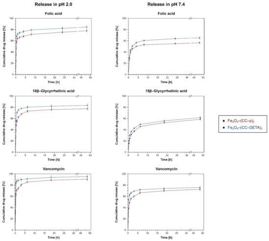 The investigated release profiles (Figure 8) show that in an acidic environment of pH 2.0, a burst release appears within the first 2 h, which is connected with the drastic protonation of drugs’ carboxylate domains, hindering the attractive interactions between the materials and the drugs. Such a burst release led to the release of approximately 65–85% of the drugs in 2 h, with a slight drug release increase within the next 2 days of incubation. On the other hand, the experiments involving the material–drug complexes’ incubation in PBS solution of pH 7.4 showed that the progressive release of the biomolecules reached a quasi-plateau after 8 h for folic acid and vancomycin. In the case of 18β–glycyrrhetinic acid, its release in pH 7.4 proceeded with a continuous manner within the full time of incubation. Moreover, in each release profile, a similar trend of a slightly higher release percentage from Fe3O4–(CC–DETA)2 than Fe3O4–(CC–p)2 is observed. It may be caused by the more disruptive influence of the adsorbing agents used towards interactions between carboxylate groups of the drugs and protonated –NH3+ groups of the terminal DETA domain than those of the –NH2+– groups of piperazine. Furthermore, among all the studied drugs, vancomycin exhibits its highest release percentage from the triazine-based dendron-functionalized materials, varying between 72.5% and 95.2%, which might be a result of the least intensive interaction between vancomycin and the materials’ surface due to the drug’s steric hindrance. Nevertheless, the cumulative drug release after 48 h incubation of folic acid– and 18β–glycyrrhetinic acid-loaded materials ranged between 56.4% and 84.5% and 58.6% and 83.4%, respectively, indicating their efficient release to the aqueous media.