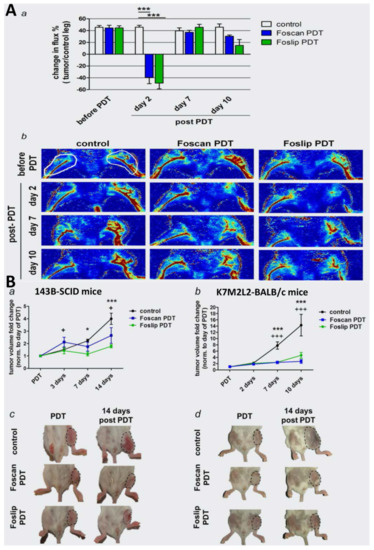Inhibition of intratibial osteosarcoma growth based on PDT using Foscan or Foslip. (A) (a) Blood flow in control and tumor-bearing hind limbs was measured with a laser Doppler perfusion imager in the regions of interest (ROI) (as indicated in (b)), and the data are presented as percent change in perfusion (flux) of tumor compared to normal tissue, *** p < 0.001. (b) Images of hind limb perfusion. White circles indicate ROI for laser Doppler image analysis. (B) (a) Mean fold change in size of intratibial 143B cell line-derived tumors in SCID mice and (b) of intratibial K7M2L2 cell line-derived tumors in syngeneic BALB/c mice. + p < 0.05, +++ p < 0.001, Foscan PDT vs. control; * p < 0.05, *** p < 0.001, Foslip PDT vs. control. (c,d) Photographs taken at the end of treatment study. Dotted lines indicate tumor areas. Reproduced from ref. [90] with permission from Wiley Online Library. Copyright (2017) International Journal of Cancer.