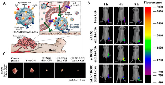 (A) Schematic illustration of (ALN/cRGD)@dHA-Ce6. (B) In vivo noninvasive photoluminescent tumor imaging of free Ce6 (2.5 mg/kg) or each sample (equivalent Ce6 2.5 mg/kg) intravenously injected into MDA-MB-231 tumor-bearing nude mice. Fluorescent tumor images of the limbs were obtained at 1, 4, and 8 h post-injection. (C) Optical images of tumor samples extracted from MDA-MB-231 tumor-bearing nude mice. Reproduced from ref. [106] with permission from MDPI AG. Copyright (2020) Biomedicines.