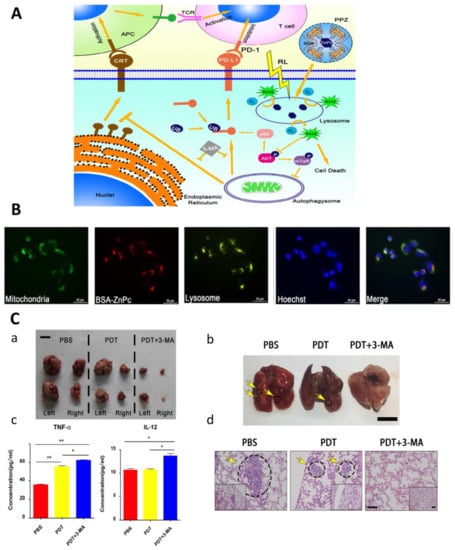 (A) Schematic overview of the anti-tumor immune response in osteosarcoma induced by the combination of PDT and 3-MA. (B) PDT using BSA-ZnPc induced autophagy in osteosarcoma cell lines. The distribution of mitochondria, lysosomes, and BSA-ZnPc in MNNG/HOS cells after treatment with BSA-ZnPc for 24 h (sacle bar = 50 µm). (C) Combined therapy of PDT and 3-MA inhibited tumor growth in a distant metastasis subcutaneous tumor model. (a) The tumors located on both flanks were resected and imaged (bar = 5 cm). (b,d) The images and H&E staining of lungs resected from the tumor-bearing mice (circles represent the metastatic, (b): bar = 1 cm, (d): left bar = 100 µm, right bar = 200 µm). (c) Mice sera were collected 1 day after combination treatment, and the cytokine levels of TNF-α and IL-12 were measured. * p < 0.05, ** p < 0.01. Reproduced from ref. [166] with permission from Elsevier. Copyright (2019) Biomaterials.