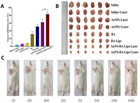 (A) The tumor inhibition rates. (B) Photographs of tumors after 14 days of treatment. (C) Representative photographs of tumor-bearing mice after 14 days of treatment. (i) saline, (ii) saline + Laser, (iii) AuNP-Laser, (iv) AuNP + Laser, (v) BA, (vi) BA-Lips, (vii) AuNS-BALips-Laser, (viii) AuNS-BA-Lips + Laser. The tumor was marked with dashed circles. ** p < 0.01. Reproduced from ref. [233] with permission from Elsevier. Copyright (2017) Nanomedicine.