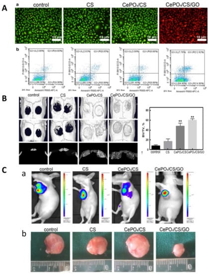 (A) (a) live-dead cell staining. (b) flow cytometry of MDA-MB-231 cells for different groups under NIR laser irradiation for 10 min every day. It was found that the MDA-MB-231 cells in the control, CS and CePO4/CS control groups were live cells, while those in the CePO4/CS/GO group were dead cells (green represents live cells and red represents dead cells). (B) Micro-CT images and bone volume/tissue volume (BV/TV) of skulls 3 months after the surgery. ** p < 0.01, vs control. (C) (a) Fluorescence detection on nude mice after NIR laser irradiation and fluorescence intensity of the CePO4/CS/GO group was significantly lower than the blank, CS and CePO4/CS groups. (b) Optical picture of tumors in nude mice. Reproduced from ref. [262] with permission from BioMed Central. Copyright (2021) J Nanobiotechnol.