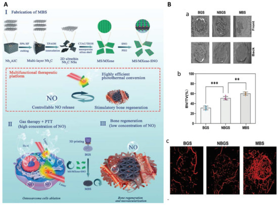 In MXene nanaosheets, ‘M’ refers to transition metal atoms, ‘X’ means carbon or nitrogen, and ‘ene’ represents ultrathin 2D structure such as graphene [281]. As MXene nanosheets combine the advantages of metallic materials and non-metallic materials, they have been widely used in biomedicine including biosensing, fluorescent imaging, and PTT [282,283,284,285]. Pan et al. explored the PTT effects of 3D-printed bioactive glass (BG) scaffolds containing titanium carbide (Ti3C2) nanosheets on the treatment for osteosarcoma. The incorporation of Ti3C2 MXenes endowed the composite scaffolds with high photothermal conversion efficiency, leading to complete tumor eradication in mice with xenografts of Saos-2 cells. The composite scaffolds could also accelerate bone regeneration after implantation [286]. Yang et al. developed 3D-printed BG scaffolds (BGS) incorporated with S-nitrosothiol-grafted mesoporous silica containing niobium carbide (Nb2C) nanosheets (MBS) for the treatment of bone cancer (Figure 6). Upon NIR laser irradiation, photothermal conversion could be achieved via Nb2C MXenes and nitric oxide (NO) release could be triggered and controlled. Tumor ablation was strengthened by the combination of MXene-mediated PTT and NO release, as NO at high concentrations could induce DNA damage and inhibition of DNA repair [287,288]. The tunable NO release could also promote vascularization and osteogenesis [289,290]. Therefore, this composite scaffold has the potential for a multifunctional therapeutic platform for osteosarcoma therapy, vascularization, and bone regeneration [291]. Recently, Yin et al. develop implants with multiple functions which comprised Ti3C2 MXenes loading with tobramycin (an antibacterial drug), gelatin methacrylate (GelMA) hydrogels, and bioinert sulfonated polyetheretherketone (PEEK). PEEK substrates was first coated with polydopamine (PDA) to enhance the adhesion of the surface, and tobramycin-laden MXenes was then bonded to PEEK followed by GelMA coating. The combination of MXenes and PDA endowed the composites with synergistic photothermal effects, and the GelMA coating promoted bone regeneration. The results showed that the obtained composite implants exhibited superior cytocompatibility, antibacterial effect, PTT-mediated anti-tumor effects, and the capacity of promoting osteogenesis [292].