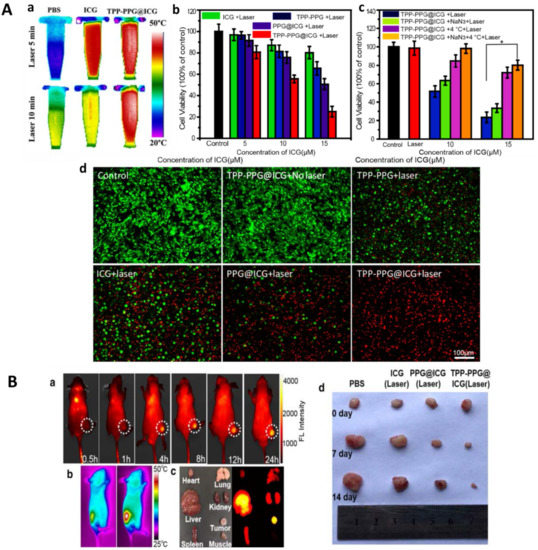 Fluorescence imaging for bone cancer therapy based on NIR dyes has the advantages of visible delivery and therapy [314,315,316]. ICG is a medical imaging and diagnosis NIR dye approved by FDA for clinical use [317,318]. As mentioned above, it can be used not only for PDT but also for PTT. MSCs, nanoparticles, and hydrogels are often used as the carriers of ICG to target to and then accumulate in tumors [319,320,321]. Jiang et al. designed bone-targeting nanoparticles with photothermal effects for bone cancer treatment. They conjugated superparamagnetic Fe3O4 nanoparticles with ZA followed by ICG modification. ZA acted as a bone-targeting factor, while Fe3O4 and ICG were employed as PTAs to enhance the PTT effect. ICG could also provide the capacity of real-time fluorescence monitoring during the treatment. These nanoparticles could rapidly and accurately located in the medullary cavity of the mice tibia, and then ablated the tibial metastasis of breast cancer cells [322].