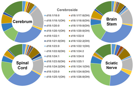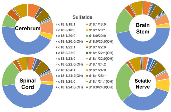 The total absolute levels of the four sphingolipid classes analyzed in the cerebrum, brain stem, spinal cord, and sciatic nerve are summarized in Figure 5, whereas the profiles of the individual molecular species of each of the lipid classes are summarized in Figure S1. In summary, the following points could be drawn from the study: (1) the total content of these sphingolipids increased from the cerebrum to the brain stem, sciatic nerve, and spinal cord, which largely reflects the differences in the myelin content; (2) the sulfatide content was roughly a third of the cerebroside content in all of the tissues, as has been previously reported [12,21]; and (3) the ratios of cerebroside and SM provide some rough information about the abundance of the myelin sheath relative to the neural cell body membrane, since the former is largely present in the myelin, whereas the latter is largely present in the cellular plasma membrane.