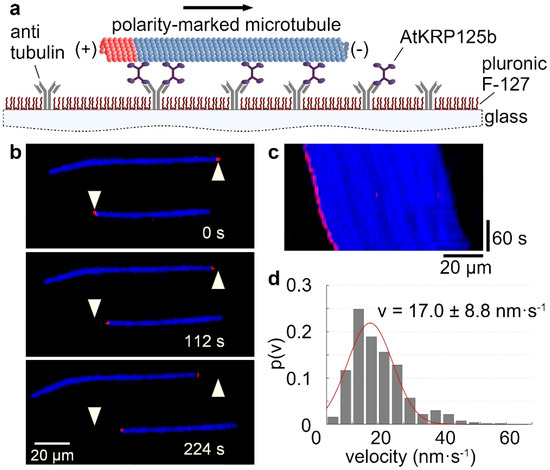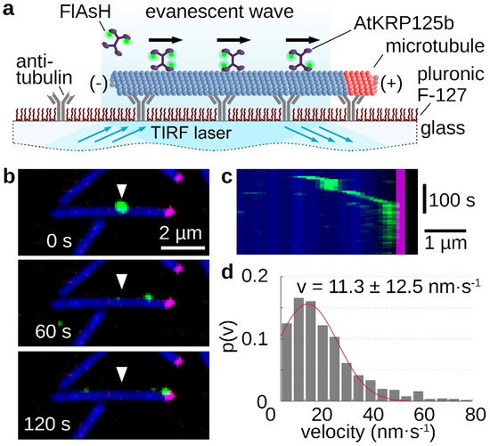 For the expression plasmid, AtKRP125b cDNA was cloned into the pFastBac1-vector (Invitrogen, Waltham, MA, USA) by using overlap extension PCR cloning [37]. In the cloning procedure, a His-tag and tetracystein-tag were added, respectively. After expression in High Five Cells (BTI-TN-5B1-4), recombinant His-tagged protein was purified via metal affinity chromatography (HisTrap by GE Healthcare, Chalfont St Giles, UK), snap-frozen in liquid nitrogen, and stored at −80 °C or used immediately. Microtubules were purified and polymerized as described before [38,39]. Polarity-marked microtubules were polymerized as described previously [40]. Cy5-labelled tubulin was used to prepare the seeds and Dylight 594-labelled tubulin for the elongation, resulting in Dylight 594-labelled plus ends. Digoxigenin-labelled microtubules were prepared as described previously [39] using a mixture of digoxygenin-labelled tubulin and Cy5-labelled tubulin in a 1:5 ratio.