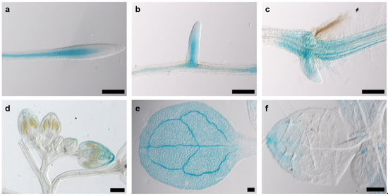 Since cell division in plants occurs almost exclusively in meristematic tissue, we assumed that the promoter activity of AtKRP125b is most pronounced in or even restricted to meristems. GUS staining of eight-day-old pAtKRP125b::GUS seedlings revealed blue staining of leaves and roots. Promoter activity was observed in vascular tissue in the root (Figure 4a), in emerging lateral roots (Figure 4b), in the basal region of the hypocotyl (Figure 4c), in the petals of young flowers (Figure 4d), and the apex and vascular tissue of cotyledons and true leaves (Figure 4e,f). In 24-day-old pAtKRP125b::GUS plants, the promoter was also active in vascular tissue of petals, the stigma, and anthers of mature flowers and in the remnants of the stigma and in the internode of young siliques (data not shown). Remarkably, no GUS staining was detected in mitotically active tissue such as the root apical meristem or the flowering meristem, which contradicts our hypothesis that AtKRP125b shows a role in the mitotic spindle. However, we cannot exclude the possibility that not all regulatory elements were captured with the selected promoter sequence. A repeat of the experiment with a longer promoter sequence failed to transform with agrobacteria due to the length of the construct.