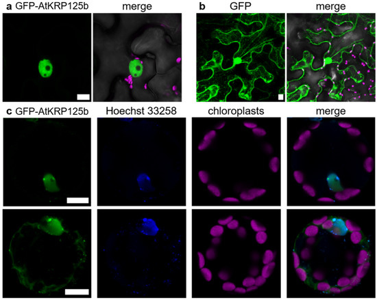GFP-AtKRP125b is localized in the nucleus and cytoplasm. (a) Fluorescent image of transient expressed GFP-AtKRP125b (green) in Nicotiana benthamiana leaf pavement cells. The second image shows a merge of three channels: GFP-AtKRP125b (green), bright field (grey) and chlorophyll autofluorescence (magenta). (b) Fluorescent image of transiently expressed free GFP as a comparison to (a). Scale bars: 10 µm. (c) Co-localization of GFP-AtKRP125b and nucleus in Arabidopsis thaliana mesophyll protoplasts. Images show transient expression of GFP-AtKRP125b (green), nuclei staining with Hoechst 33342 (blue) and chloroplast autofluorescence (magenta). The upper images show a protoplast without a signal in the cytoplasm. The lower images show a maximum intensity projection of a protoplast with an additional GFP-AtKRP125b signal in the cytosol.
