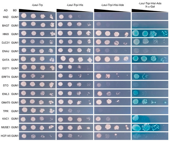 Taken together, we identified 15 candidate interacting partners of GUN1. Interestingly, other proteins without chloroplast localization also showed interactions with GUN1 in our Y2H screening. We cannot rule out the possibility of false-positive interactions, which is a common problem in Y2H assays. However, there are also alternative possibilities. First, those candidate proteins might have multiple subcellular localizations. There have been a large number of studies demonstrating proteins with dual localization. For example, the DnaJ-like zinc-finger protein ORANGE was initially identified as a chloroplast protein in leaves and fruits but recently found its nuclear localization in cotyledons of germinating seedlings [25,26,27]. Second, for some candidate proteins, their subcellular localizations were only predicted by software and still need further experimental verification.