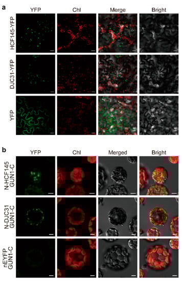 To further confirm the identified interactions, we selected two proteins, DJC31 and HCF145, both of which were reported to have chloroplast localization [21,22], and tested their in planta interactions with GUN1 by BiFC assays. Because there is a recent report that DJC31 attached to the cytosolic side of the endoplasmic reticulum membrane [23], we checked the subcellular localization of both proteins prior to our analysis. When the YFP fusion proteins of DJC31 and HCF145 were constitutively expressed in the transfected tobacco leaves, their fluorescent signals merged nicely with the chlorophyll autofluorescence from chloroplasts, demonstrating the localization of both proteins at chloroplasts (Figure 2a). This observation did not exclude the presence of these two proteins elsewhere but rationalized their interaction with GUN1 in chloroplasts. We then transformed protoplasts prepared from Arabidopsis mesophyll cells to express GUN1 and its individual candidate partner, fused with cEYFP and nEYFP, respectively, and observed under a confocal microscope. The fluorescent signal of the reconstituted EYFP was observed in the protoplasts co-expressing both fusion protein pairs, indicating their in planta interactions (Figure 2b). Moreover, the fluorescent signals of the reconstituted EYFP also merged with chlorophyll autofluorescence (Figure 2b), supporting the view of chloroplasts as the site for their interactions (Figure 2b). As expected, no signal was detectable in the negative controls using an empty vector with GUN1-cEYFP (Figure 2b).