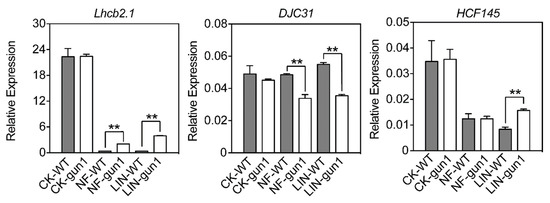 Expression of genes for DJC31 and HCF145 in response to norflurazon and lincomycin treatments. Arabidopsis thaliana Col-0 wild-type (WT) and gun1 mutant seedlings germinated on 1/2 MS plates supplemented with norflurazon (NF, 5 μM) or lincomycin (LIN, 220 μg mL−1) under growth condition for 7 d were analyzed. Transcript abundance was determined by qRT-PCR with Actin2 as a reference. Data represent means ± SD (n = 3). Asterisks indicate significant differences between the WT and gun1 mutant under the same treatment (** p < 0.01, Student’s t test).