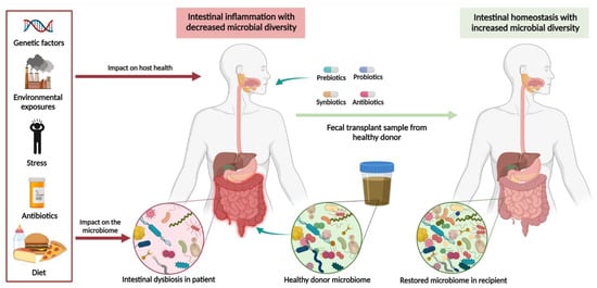 Various genetic and environmental factors have been implicated in UC susceptibility [2]. To date, over 200 single nucleotide polymorphisms (SNPs) have been associated with the risk of developing UC [3]. Epidemiological studies have shown a higher incidence of UC among populations adopting Western diets rich in refined sugars, dairy, protein, and animal fat, and low in dietary fiber including wholegrains, fruits, and vegetables [4]. The role of environmental influences aligns with the hygiene hypothesis, which states that limited exposure to microorganisms during infancy and childhood may impair appropriate priming and development of the immune system, thus promoting autoimmunity [5]. Exposure to antibiotics during gestation and childhood, psychological stress, and family history also affect the risk of developing UC [6]. These factors profoundly alter the intestinal microbiome but may also provide opportunities for new treatment options.