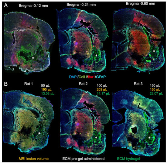 - Ghuman, H.; Gerwig, M.; Nicholls, F.J.; Liu, J.R.; Donnelly, J.; Badylak, S.F.; Modo, M. Long-term retention of ECM hydrogel after implantation into a sub-acute stroke cavity reduces lesion volume. Acta Biomater. 2017, 63, 50–63. [Google Scholar] [CrossRef]