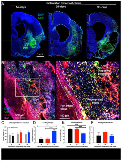 Damian, C.; Ghuman, H.; Mauney, C.; Azar, R.; Reinartz, J.; Badylak, S.F.; Modo, M. Post-Stroke Timing of ECM Hydrogel Implantation Affects Biodegradation and Tissue Restoration. Int. J. Mol. Sci. 2021, 22, 11372. https://doi.org/10.3390/ijms222111372