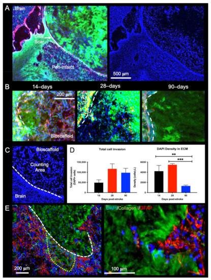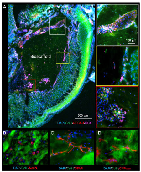 - Modo, M. Bioscaffold-Induced Brain Tissue Regeneration. Front. Neurosci. 2019, 13, 1156. [Google Scholar] [CrossRef] [Green Version]