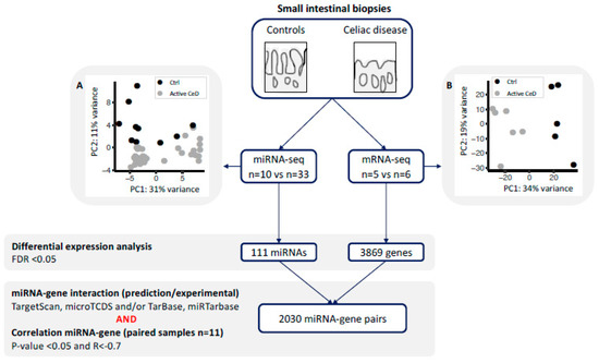 Recently, extracellular miRNAs in the circulation have been proposed as biomarkers for CeD [12]. The small intestine could be the source of these circulating miRNAs, as it has been shown that the small intestinal miRNA profiles are different between CeD and controls [13,14,15,16,17]. However, the functional roles of both circulating and intracellular miRNAs in CeD pathophysiology are not yet fully understood. To uncover the functions and pathways in which CeD-associated miRNAs play a role, the transcripts targeted by the deregulated miRNAs need to be identified. One expects that when miRNAs are overexpressed, target transcripts are downregulated [14,17]. It is also important to investigate these interdependencies in a tissue-specific context, as miRNA expression is highly cell type‒specific [10,18,19]. In the context of CeD, only a few miRNA‒transcript pairs have been investigated thus far as no high-throughput studies have searched for such miRNA‒target transcript pairs in CeD [14,17].