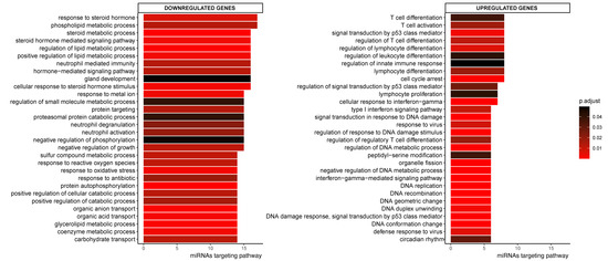 Top 30 enriched GO pathways associated with the down- or upregulated genes in CeD that are targeted by at least one miRNA. Sorted by how many miRNAs targeted the transcripts in the pathway. The colorscale indicates significance of pathway enrichment as indicated with p.adjust.