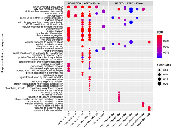 We prioritized miRNA target transcripts based on the criteria that they are targeted by multiple miRNAs and that there is supporting experimental evidence for the miRNA‒target transcript interaction. This analysis identified 492 transcripts that were targeted by at least two miRNAs, and there is experimental evidence for at least one of the interacting miRNAs for 34% (168/492) of these target transcripts. The downregulated targets (118/168) are significantly enriched with transcripts involved in metabolic pathways (phospholipid metabolic process, FDR = 0.03) and epithelial cell maturation (FDR = 0.046), whereas the upregulated transcripts targets are involved in cell-cycle pathways (e.g., mitotic nuclear division, FDR = 0.003), positive regulation of type I interferon (FDR = 0.03), and the NOTCH pathway (FDR = 0.023).