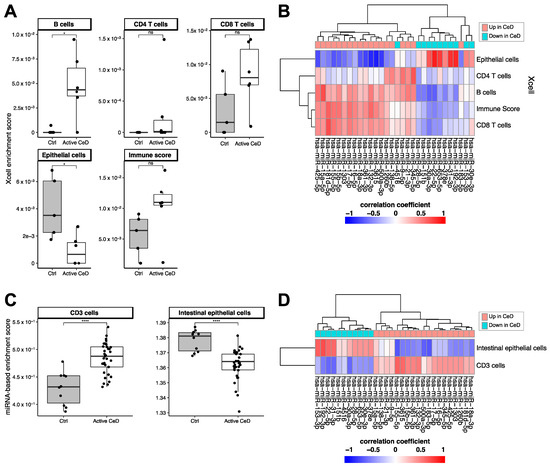 Using the xCell package, we calculated cell type‒enrichment scores based on the RNA-seq data for multiple cell types relevant in CeD pathophysiology: epithelial cells, CD4- and CD8-positive T-cells, and B-cells (Figure 5A,B). Although the differences between CeD (n = 6) and controls (n = 5) did not reach significance for any of these cell types, immune cells did show a higher enrichment in CeD biopsies (B-cells: p = 0.03; CD8+ T-cells p = 0.076; immune cell score p = 0.094), and epithelial cells were significantly depleted in CeD compared to controls (p = 0.03) (Figure 5A). To investigate in which cell types the miRNAs in the miRNA‒target transcript network are expressed, we correlated the expression levels of the miRNAs with the cell type–enrichment scores. Figure 5B shows that miRNAs downregulated in CeD were correlated with enrichment for epithelial cells and that miRNAs upregulated in CeD were correlated with enrichment for immune cells.