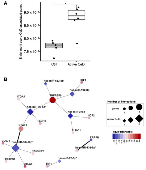 A previous study integrated multiple in-silico approaches to prioritize genes in CeD-associated genomic risk regions and identified 118 genes as likely causal in CeD [9]. Our data show a clear enrichment of the transcripts of these prioritized genes in CeD biopsies (Figure 6A). Of the 118 genes, 102 were expressed in our biopsy transcriptome dataset, and 13 of the 102 are also found in our miRNA‒target transcript network (Figure 6B). This suggests that, in addition to being affected by genetic factors that predispose to CeD, these genes might also be regulated post-transcriptionally by CeD-associated miRNAs. This network includes the previously mentioned STAT1 [9]. In the miRNA‒target transcript network, STAT1 is associated with miR-22-5p (R = −0.86; p = 6.6 × 10−4) and miR-30a-3p (R = −0.88; p = 3.9 × 10−4), and there is other previous experimental evidence (TarBase: HITS-CLIP) to support the interaction with miR-30a-3p (Supplementary Table S5).
