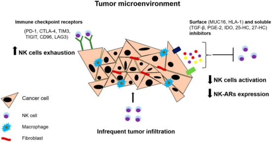 - Pesce, S.; Tabellini, G.; Cantoni, C.; Patrizi, O.; Coltrini, D.; Rampinelli, F.; Matta, J.; Vivier, E.; Moretta, A.; Parolini, S.; et al. B7-H6-mediated downregulation of NKp30 in NK cells contributes to ovarian carcinoma immune escape. Oncoimmunology 2015, 4, e1001224. [Google Scholar] [CrossRef] [PubMed]