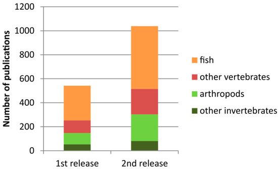 The remainder, including mammals, amphibians, birds, mollusks, and reptiles, among others, represents 28% of the database content (796 karyotypes). Although birds are the second largest class of vertebrates (after fish), they were severely underrepresented in a previous release. The current release has improved the situation in that it contains data for 83 bird species, mainly collected from a recent publication of Degrandi et al. [26]. Arthropods seem to be well represented in the database, but considering that they are the largest animal group (>1.3 million species, about 95% of all animals, source: [25,27]), their representation is relatively low (<0.1% species). It is, therefore, not surprising that the data for arthropods are steadily expanding. For example, Stahlavsky et al. [28] recently published FISH data on 18S rDNA loci for 74 scorpion species, which were not represented in the previous release. The best represented group in terms of diversity is fish, which also has relatively balanced entries for both 45S and 5S loci (Table S1). Considering animal diversity (Table 1), our information about rDNA loci is still fragmentary, but a continuous rise in publications can be envisaged.