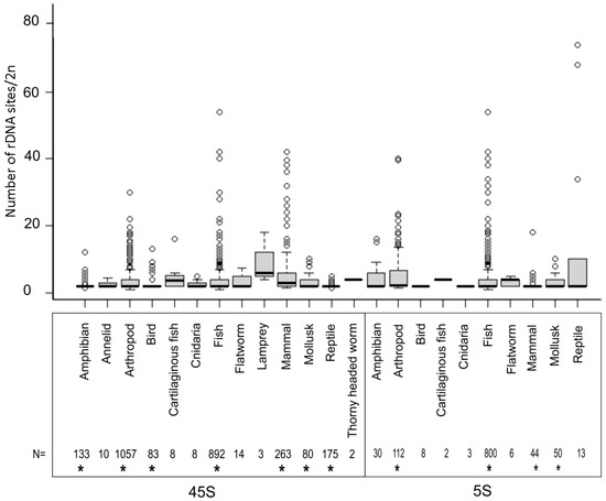 Number of 45S and 5S rDNA sites per diploid cell in different animal groups. The sample size is shown below the diagram. Boxes represent Q1, median, Q3. Outliers marked by circles were calculated from the interquartile range (IQR): < Q1−1.5 × IQR and > Q3 + 1.5 × IQR. Asterisks (*) below the numbers mark groups in which statistical tests were carried out (Table S1).