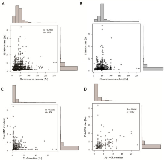 There was weak to no correlation between the number of rDNA loci and chromosome number (Figure 3A,B and statistical tests (Table S4)). This apparently holds true even for species with an extremely large (typically >160/2C) number of chromosomes, such as lampreys [35,36,37], some arthropods (e.g., the Austropotamobius genus members [38]), and some fish (e.g., Acipenser [39]), which tend to keep their rDNA locus (45S) numbers close to the median (low).