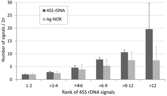 We analyzed the relationship between the number of 45S rDNA sites and the number of Ag-NOR signals (Figure 3D). As expected, there was a positive correlation between both variables (Spearman’s test, p < 0.05 (Table S4)). We also analyzed the number of Ag-NORs in groups differing in number of loci (Figure 4).
