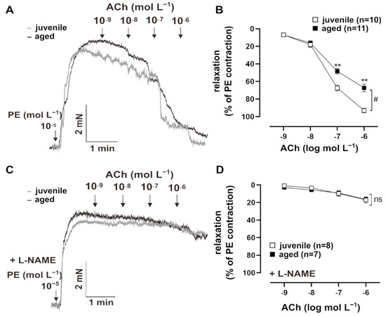 Age-related differences in relaxation to acetylcholine (ACh). (A) Representative traces and (B) concentration–response curves showing the relaxation induced by 10−9–10−6 mol L−1 ACh in juvenile and aged mesenteric arteries. Vessels were pre-contracted using 10−5 mol L−1 phenylephrine (PE). Juvenile vessels showed a higher maximum response to ACh compared to aged vessels (# p < 0.05 Brunner test, ** p < 0.01 Mann–Whitney test). Both aged and juvenile vessels had a similar sensitivity to ACh (EC50: (5.60 ± 0.35) × 10−8 mol L−1 (aged), (8.03 ± 2.05) × 10−8 mol L−1 (juvenile)). (C) Representative traces and (D) concentration–response curves showing the relaxation induced by 10−9–10−6 mol L−1 ACh in juvenile and aged vessels. Vessels were pre-treated for 30 min with L-NAME (10−4 mol L−1, indicated as “+L-NAME”), a non-selective NOS inhibitor, and pre-contracted with PE. L-NAME largely reduced ACh-mediated relaxation in both aged and juvenile vessels. There were no differences between the aged and juvenile groups.