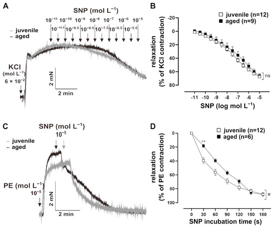 Effect of the NO donor, sodium nitroprusside (SNP), on mouse mesenteric arteries. (A) Representative traces and (B) concentration–response curves showing the relaxation induced by 10−11–10−5 mol L−1 SNP in juvenile and aged mesenteric arteries. Vessels were pre-treated with L-NAME (10−4 mol L−1) and pre-contracted using potassium chloride (KCl, 60 mmol L−1). Juvenile and aged mesenteric arteries showed similar sensitivity (EC50: (3.52 ± 3.34) × 10−6 mol L−1 (juvenile), (7.85 ± 4.71) × 10−6 mol L−1 (aged)) and maximum response (Brunner test, p >0.05, Mann–Whitney test, p > 0.05) to SNP. (C) Representative traces and (D) time–response curves showing relaxation induced by SNP (10−5 mol L−1) in juvenile and aged vessels over time. Vessels were pre-treated with L-NAME and pre-contracted with phenylephrine (PE). SNP caused faster relaxation in juvenile as compared to aged mesenteric arteries in the physiologically important range of up to 3 min (# p < 0.05 Brunner test, ** p < 0.01 Mann–Whitney test).
