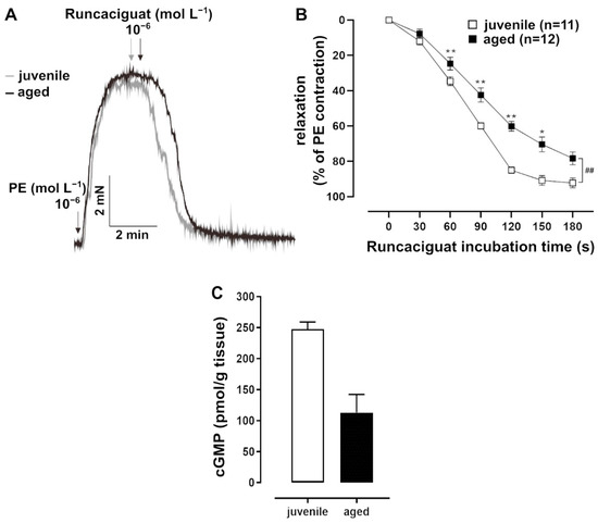 Effects of the soluble guanylate cyclase (sGC) activator runcaciguat. (A) Representative traces and (B) time–response curves showing relaxation induced by runcaciguat (10−6 mol L−1) in juvenile and aged mesenteric arteries. Vessels were pre-treated with L-NAME (10−4 mol L−1) and pre-contracted with PE. Juvenile vessels showed a significantly faster relaxation in response to runcaciguat (10−6 mol L−1) as compared to aged vessels in the physiologically important range of up to 3 min (## p < 0.01 Brunner test, * p < 0.05, ** p < 0.01 Mann–Whitney test). (C) A direct cGMP ELISA was performed on tissue lysates obtained from L-NAME-treated and PE-pre-contracted arteries 2 min after bolus application of runcaciguat (10−6 mol L−1). Juvenile vessels had higher cGMP levels than aged vessels (juvenile: n = 2 pooled samples, each with mesenteric arterial tissue from at least 5 mice; adult: n = 2 pooled samples, each with tissue from 3 mice).