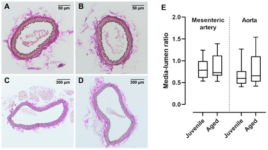 van Gieson-stained cross sections of mouse mesenteric artery and aorta. Vascular walls of both (A) juvenile and (B) aged mesenteric arteries showed no structural differences and had a similar number of elastic fibres. Neither (C) juvenile (n = 36) nor (D) aged (n = 19) aortae showed atherosclerotic alterations. (E) The media lumen ratios of juvenile mesenteric arteries (n = 26) and aortae (n = 20) were not significantly different from aged mesenteric arteries (n = 31) and aortae (n = 19), respectively (p > 0.05, Mann–Whitney test).