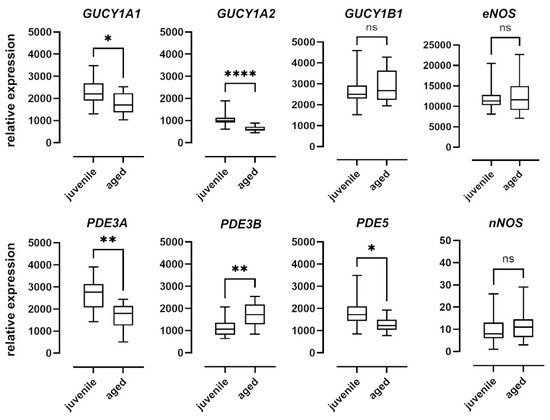mRNA expression of sGC subunits and isoforms of PDE and NOS. Expression levels of the alpha subunits GUCY1A1 and GUCY1A2 of soluble guanylyl cyclase (sGC) were significantly higher in juvenile mesenteric arteries (n = 16) compared to aged vessels (n = 10). The expression of the beta subunit GUCY1B1, however, was not significantly different. Juvenile mesenteric arteries (n = 16) showed a significantly higher expression of PDE3A and PDE5 compared to aged vessels (n = 10); however, the expression of PDE3B was significantly lower. Expression levels of both eNOS and iNOS were not significantly different between the two groups (juvenile: n = 23, aged: n = 17). Data are represented as box and whisker plots of mRNA expression levels normalized to the housekeeping gene RPL32 (* p < 0.05, ** p < 0.01, **** p < 0.0001, Mann–Whitney test).