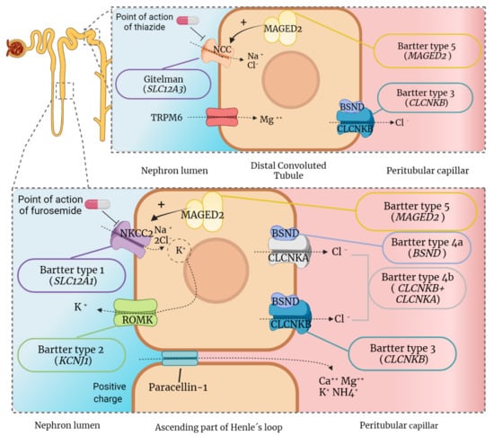 Although GS and the different types of BS share most of their clinical symptoms, they have different etiologies. Their associated proteins reside in different parts along the nephron resulting in different pathophysiological mechanisms and compensatory phenomena regarding their loss of function. For example, poor TAL functionality associated with BS causes a decrease in electrolyte bioavailability, which leads to activation of the juxtaglomerular apparatus with secondary hyperaldosteronism and glomerular hyperfiltration due to afferent arteriole dilation [].