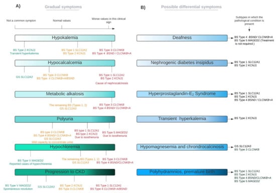 For BS there is a defined phenotype for each subtype; however, these manifestations may overlap with others, especially early in the disease []. In any case, there is not a strict correlation for the type of mutation and the disease severity, as in the case of other inherited diseases such as Autosomal Dominant Polycystic Kidney Disease [,]. Perhaps, this is due to the lower prevalence of GS and BS, which makes it more challenging to study.
