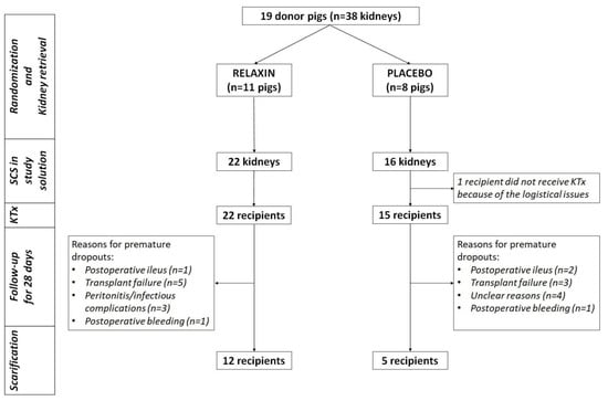 The study was designed as a blinded, randomized, placebo-controlled trial (Figure 1). Pigs were randomized to RLX and Placebo groups. Custodiol® solution (HTK, Dr. Franz Köhler Chemie GmbH, Bensheim, Germany) supplemented with 5 or 20 nM of Relaxin (Relaxera, Bensheim, Germany) or placebo (5 mg/mL Mannitol with PBS; Relaxera, Bensheim, Germany) were used for organ flushing and preservation, respectively. After randomization, both kidneys were perfused with RLX- or placebo-supplemented preservation solution and retrieved from donor pigs followed by immediate packing of each kidney in 1000 mL of respective study solution and placement on crushed ice for SCS. The right and left kidneys were implanted into randomly assigned sibling recipients after 24 or 48 h of SCS, respectively. No additional RLX was administered for reperfusion. After KT recipient pigs were followed up until the 28th postoperative day (POD) or until premature euthanasia. At the end of the experiment, all recipient pigs were euthanized for organ sampling. The numbers of kidneys in different subgroups of the experiment are presented in supplementary file-Table S1.