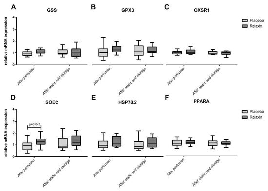 Oxidative stress-related genes expression in kidney tissue after perfusion and static cold storage in Relaxin and Placebo groups. GSS: Glutathione Synthetase; GPX3: Glutathione Peroxidase 3; OXSR1: Oxidative Stress Responsive Kinase 1; SOD2: Superoxide Dismutase 2; HSP70.2: Heat Shock Protein 70.2; PPARA: Peroxisome Proliferators Activated Receptor Alpha.