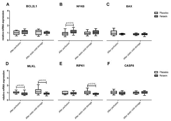 Apoptosis and necroptosis related genes expression in kidney tissue after perfusion and static cold storage in Relaxin and Placebo groups. BCL2L1: BCL2 Like 1; NFKB: Nuclear Factor of Kappa Light Polypeptide Gene Enhancer In B-cells; BAX: BCL2 Associated X Protein; MLKL: Mixed-lineage kinase domain-like protein; RIPKI1: Receptor Interacting Serine/Threonine Kinase 1: CASP8: Caspase 8.