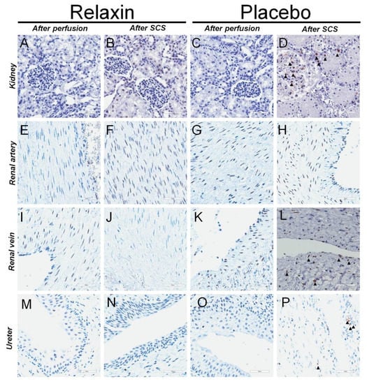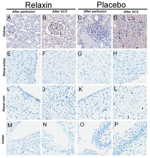 Pictures depicting typical staining for activated Caspase 3 in kidney, renal artery, renal vein, and ureter tissues after perfusion and static cold storage in RLX or control. Representative staining for kidney tissue at 100× magnification for Caspase 3 after perfusion (A) and static cold storage (B) with RLX and after perfusion (C) and static cold storage (D) with Custodiol®. Caspase 3 positive cells were more common after SCS in a Placebo group. Representative staining for renal artery tissue against Caspase 3 after perfusion (E) and static cold storage (F) with Custodiol® supplemented with Relaxin or after perfusion (G) and static cold storage (H) with Placebo. Representative staining for renal vein tissue against Caspase 3 after perfusion (I) and static cold storage (J) with Relaxin or after perfusion (K) and static cold storage (L) with Placebo. Caspase 3 positive cells were more common after SCS in a Placebo group. Representative staining for ureter tissue against Caspase 3 after perfusion (M) and static cold storage (N) with Relaxin or after perfusion (O) and static cold storage (P) with Placebo. Caspase 3 positive cells were more common after SCS in a Placebo group. All scale bars represent 50 um.