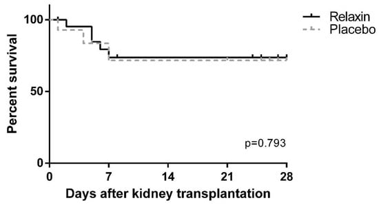 Graft survival after kidney transplantation in Placebo and Relaxin groups.