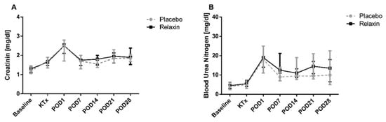 Plasma creatinine (A) and blood urea nitrogen (B) levels after kidney transplantation in Placebo and Relaxin groups. POD: postoperative day.